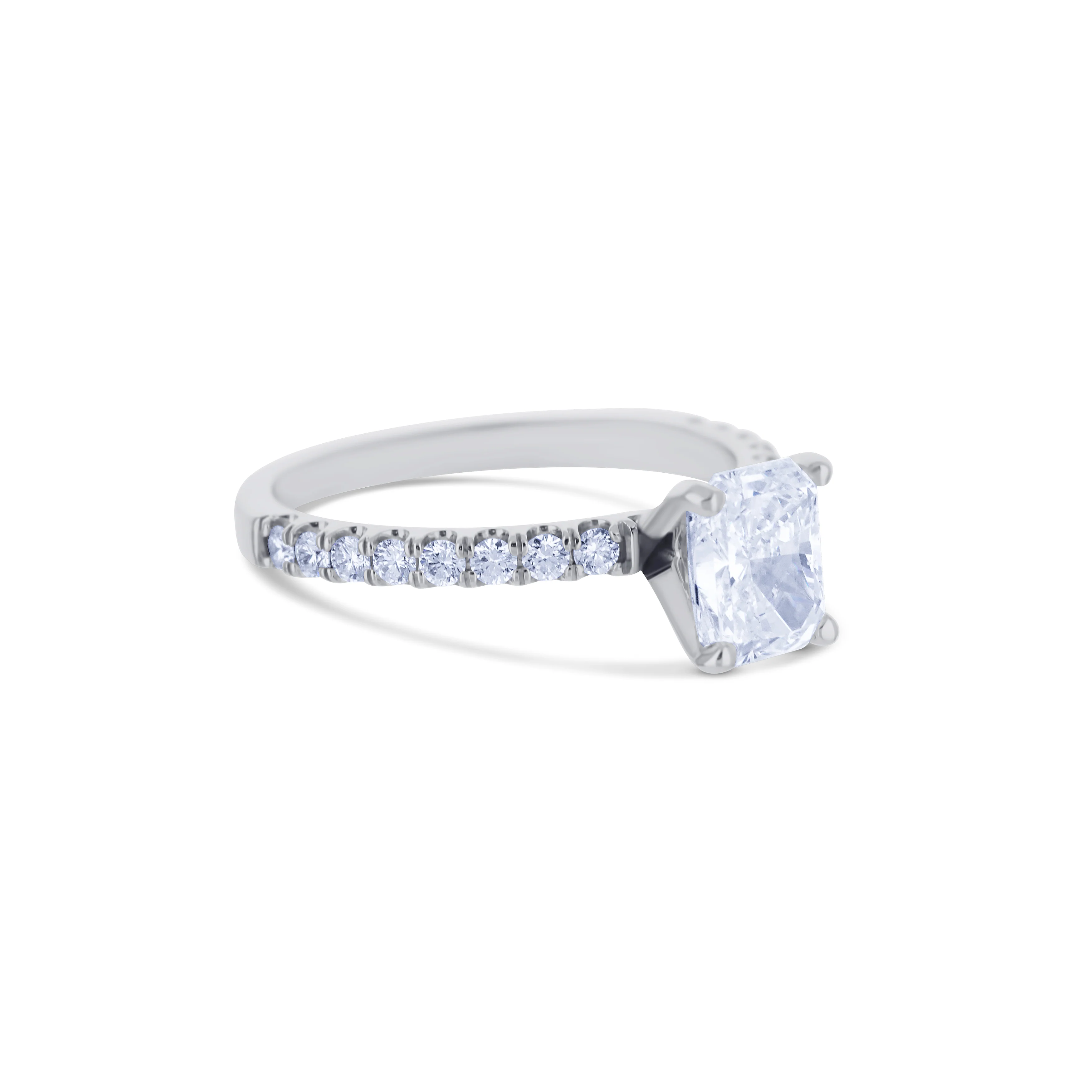 A delicate 14k white gold diamond ring with a cut-cornered rectangular center stone. This beautiful ring also has round diamonds along the band giving more sparkle to the entire piece.