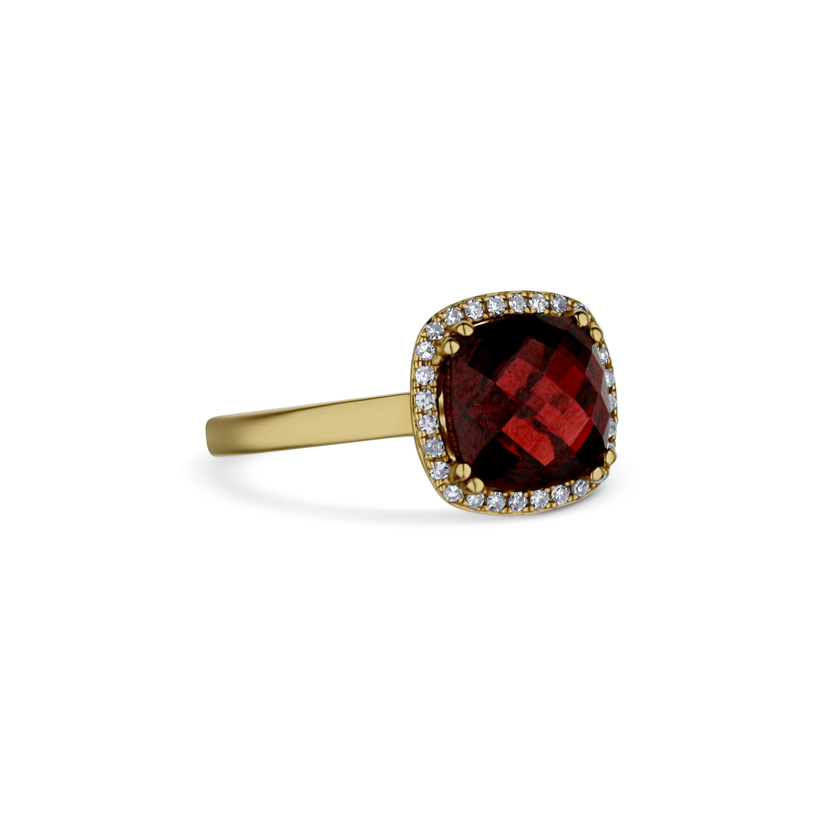A modestly sized vibrant Garnet weighing at 3.57 total carats is lovingly embraced by a halo of round diamonds. The cushion cut Garnet gemstone sits at the center of this gorgeous 14k yellow gold ring. This luxurious ring includes intricate diamond shape detailing in the basket.