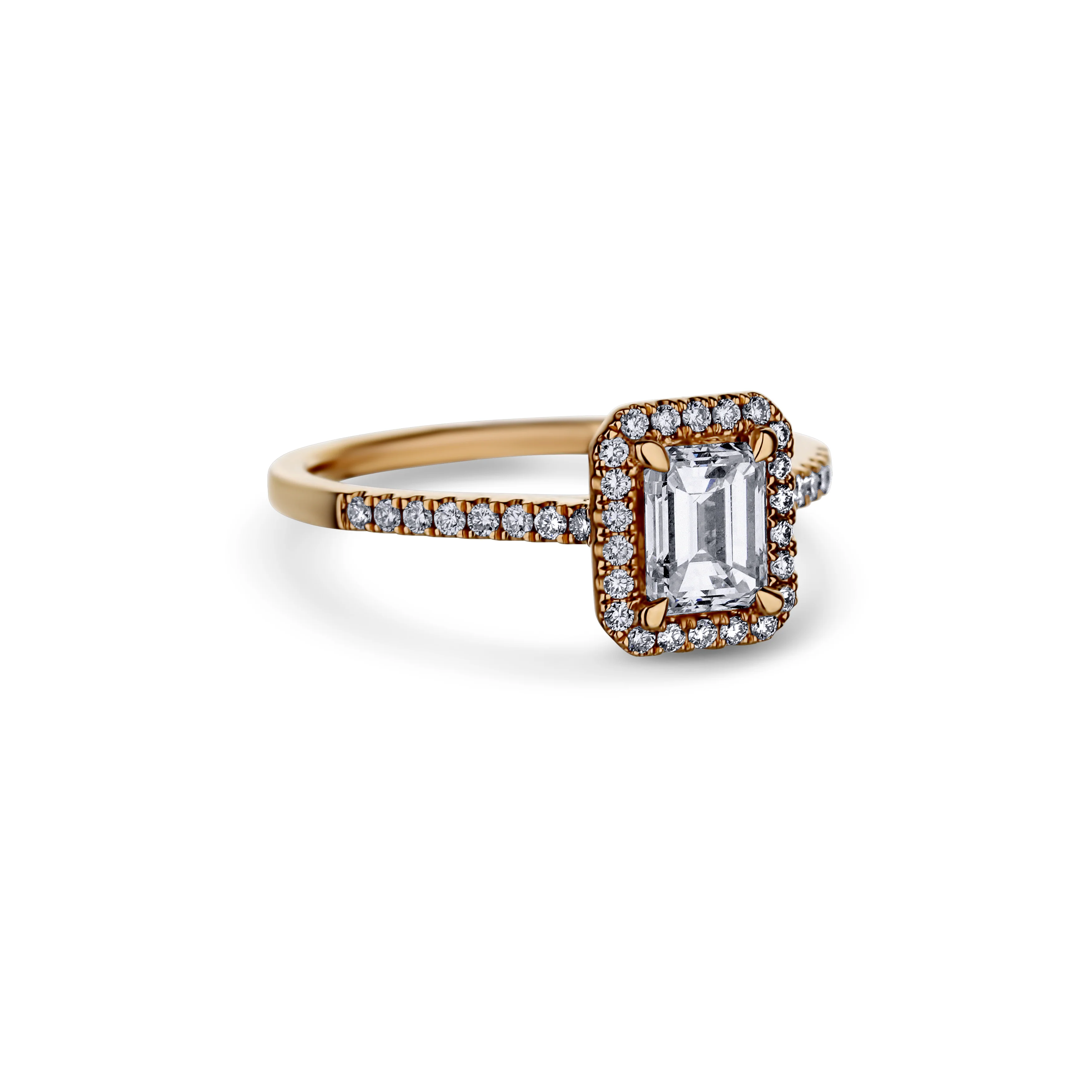 An elegant 18k rose gold emerald cut diamond ring with halo. This rose piece is beautifully crafted with round diamonds along the halo and half the band. Each round diamond has a total carat weight of 0.23 carats. With this beautiful ring, it is a perfect way to express your refined tastes.