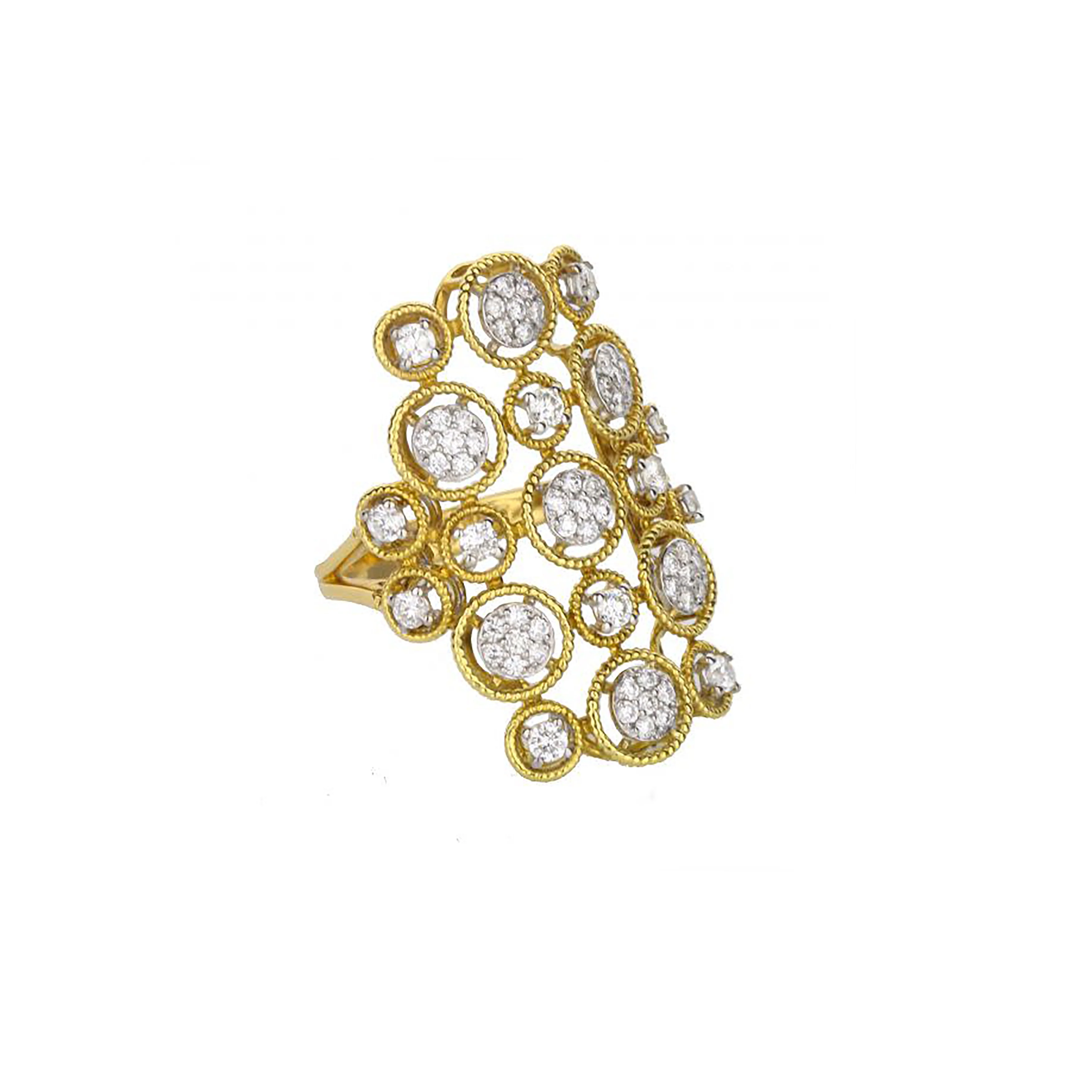 Gorgeous 18K white and yellow gold diamond ring. A symmetrical long and wide pattern of round bubbles covers the top of the ring. Round brilliant-cut diamonds are set in the white gold. Yellow gold textured rings encircle the bubbles and create the shape of the ring. The shank is yellow gold.