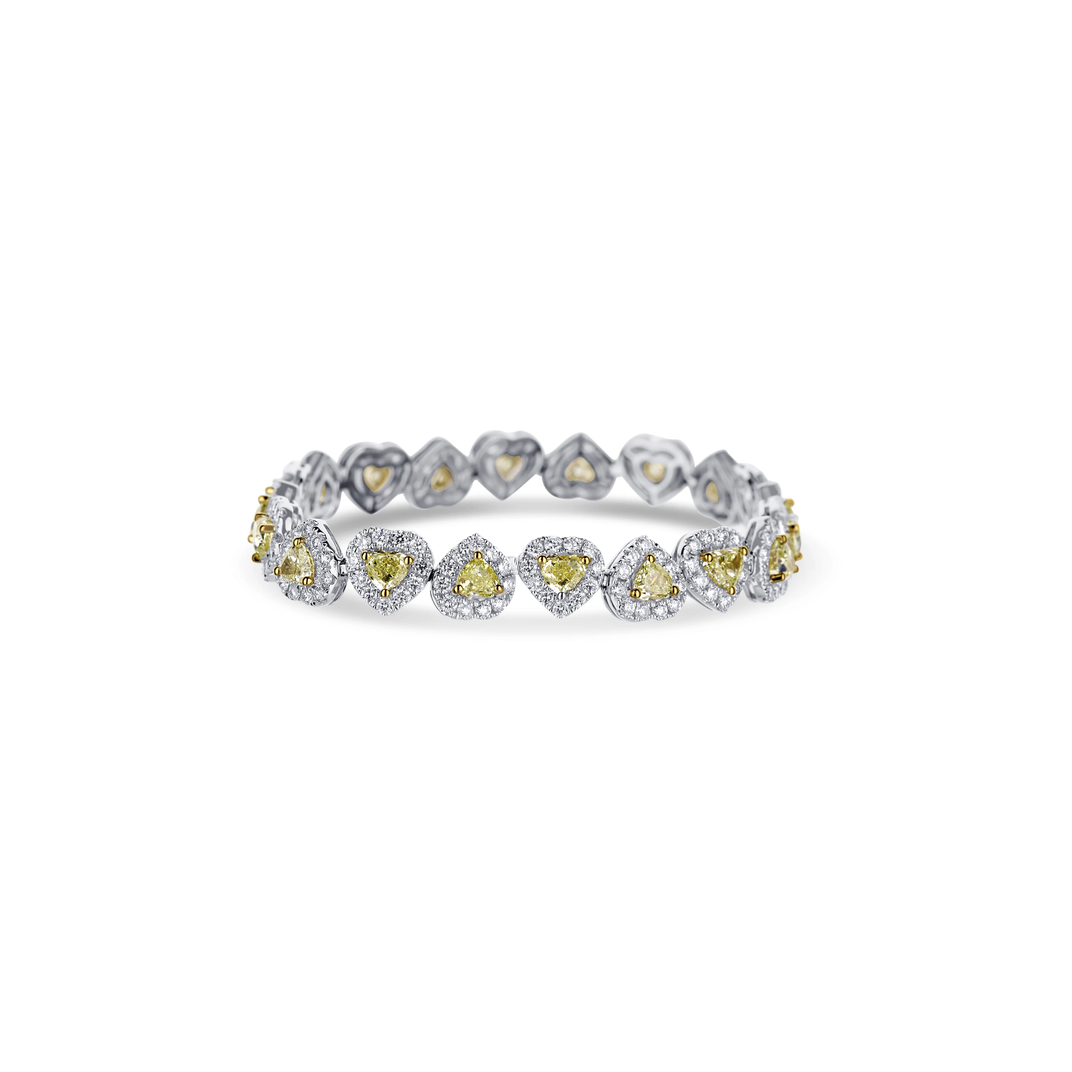 This beautiful tennis bracelet features yellow heart cut diamonds circled by a halo of small round brilliant cut diamonds set in white gold settings. This bracelet features 20 fancy yellow heart shape diamonds.