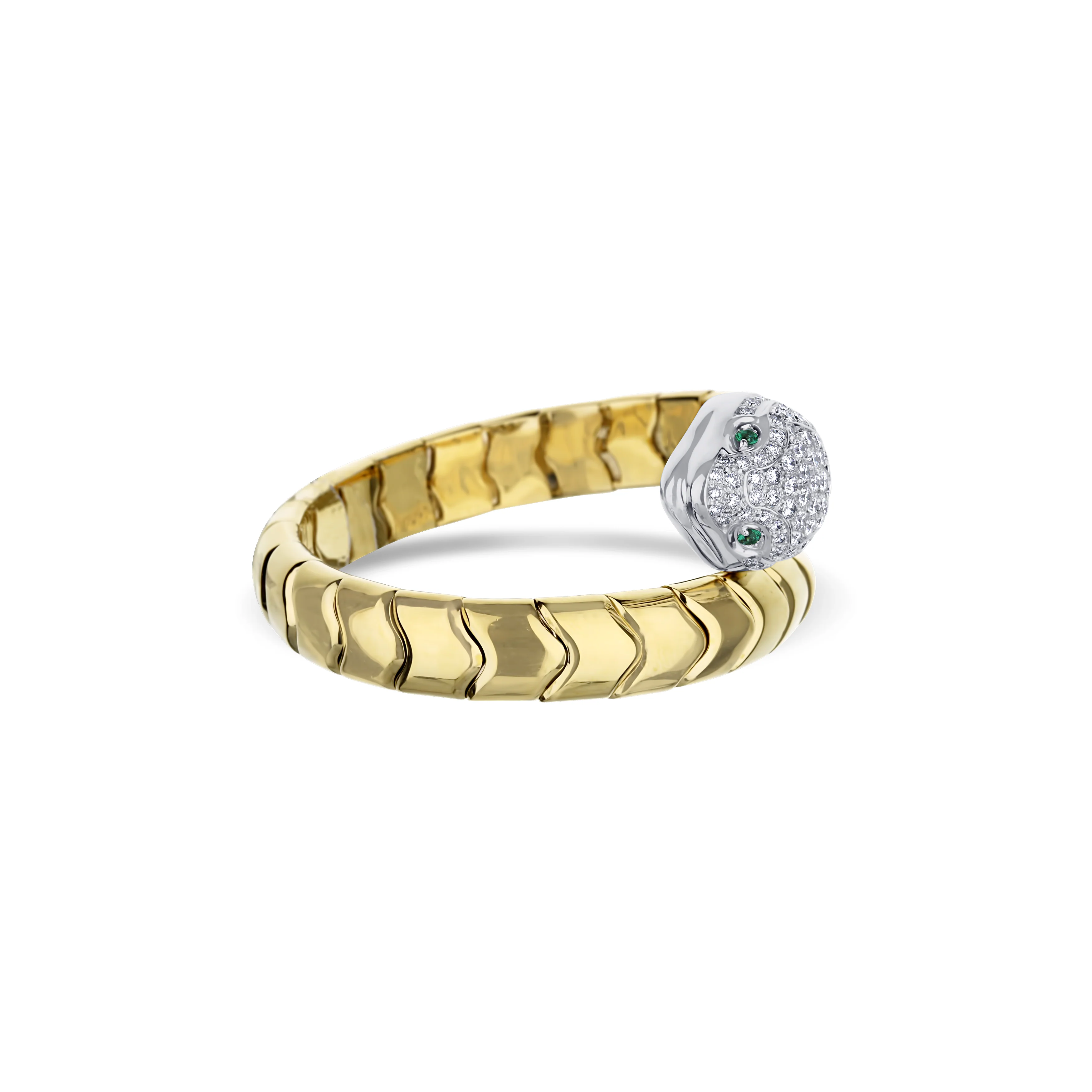 Crafted in 18K yellow gold, this sculptural snake cuff bracelet features pavé-set diamonds totaling approximately 2.05 carats. The coiled design creates a bold silhouette while the diamonds add refined brilliance.