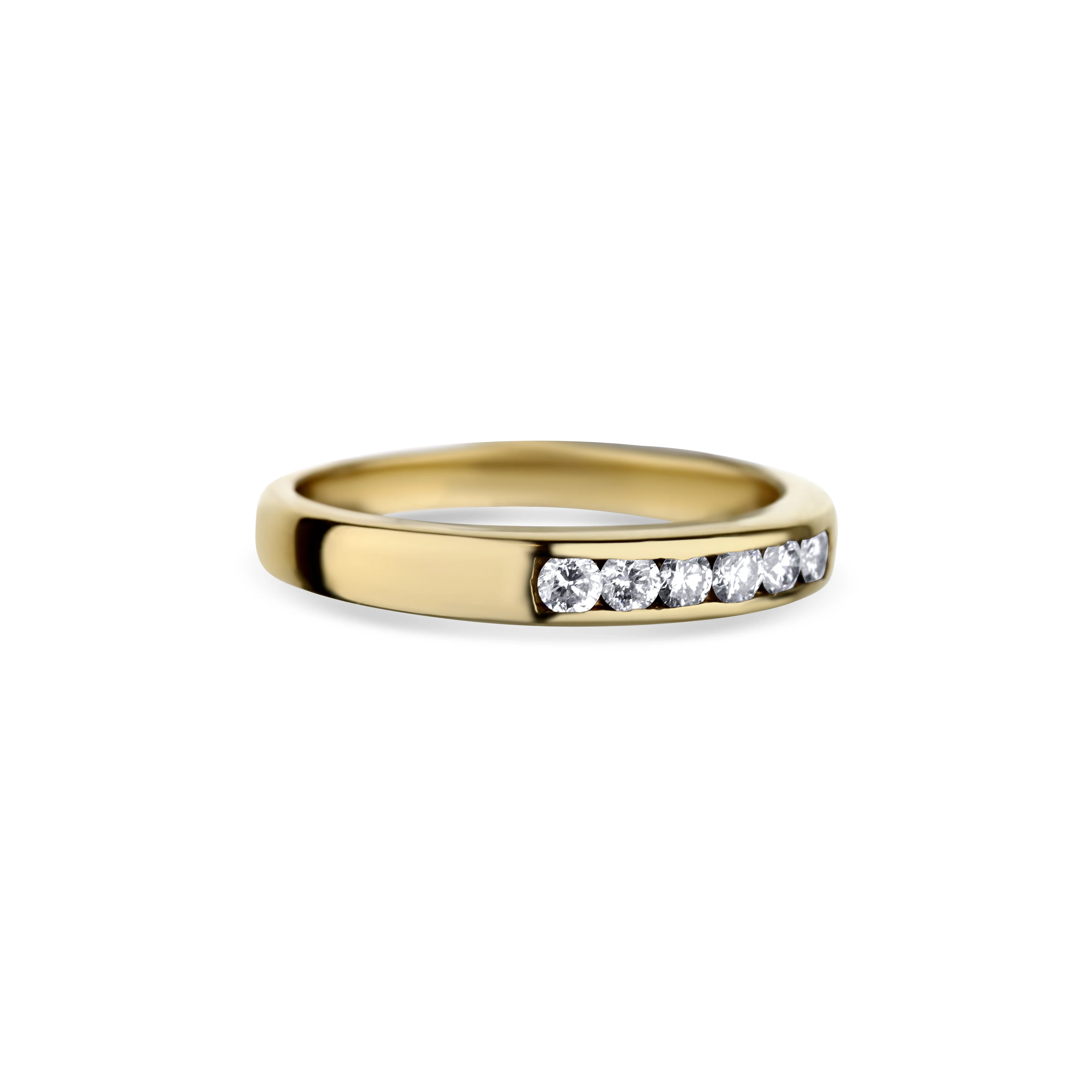 This sweet diamond band includes individually set round diamonds crafted in 14k yellow gold measuring to a total carat weight of 0.18cts. Shaped to perfection, this band may stand alone or in addition to a wedding ring. This ring is a finger size 5. Most rings we offer may be resized, please contact us for further information and cost.