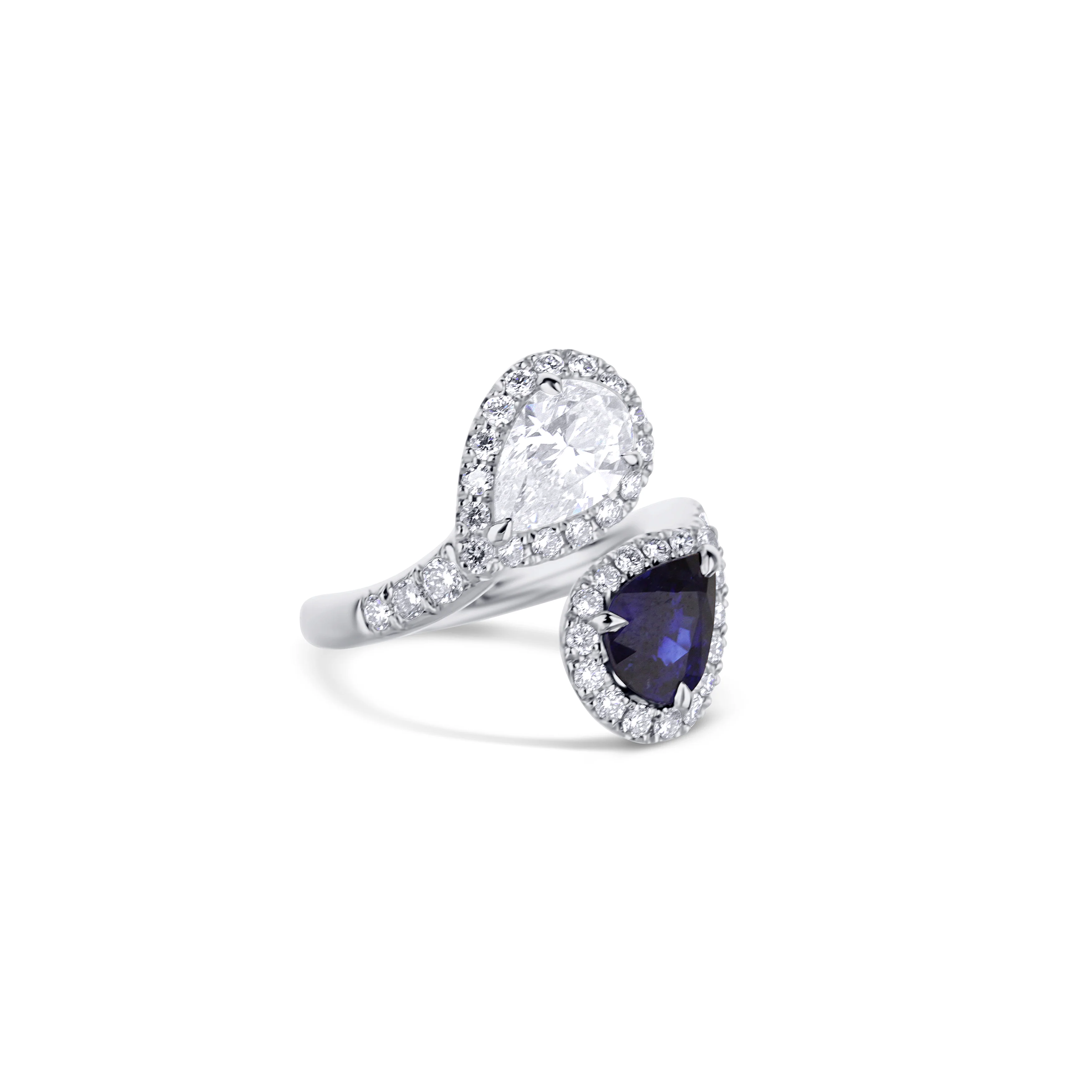 Beautiful platinum bypass engagement ring with a 1.55 carat pear cut blue sapphire and 1.5 carat pear cut diamond. Each stone is surrounded by a round diamond halo, and round diamonds continue part-way along the shank.