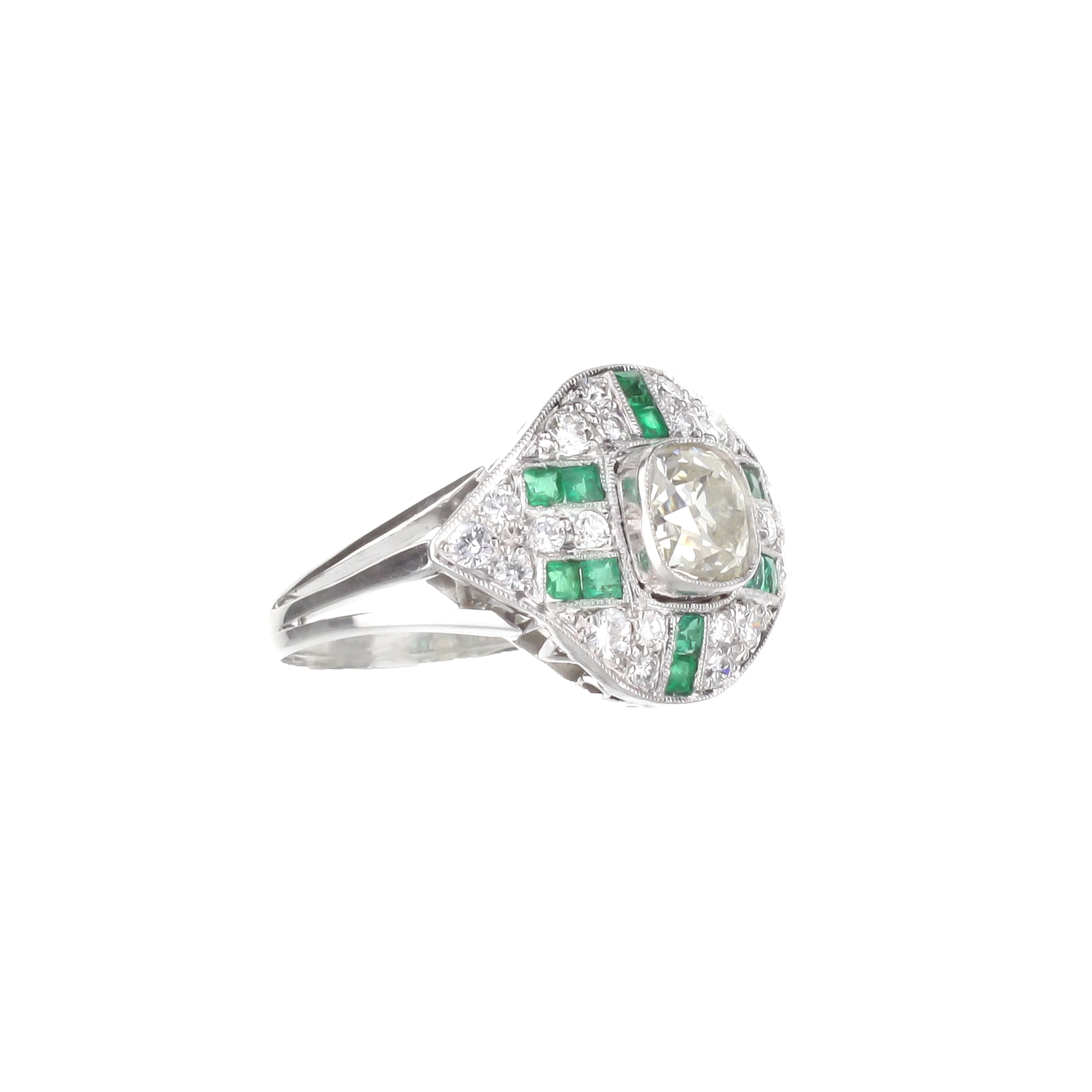 Antique Art-Deco inspired ring starring 1 Old Mine cut diamond weighing at .90 carats. Also includes 4 sets of fascinating and vibrant green Emeralds equaling to .24 carats total. Burdeen's Jewlery hosts an array of exotic diamond and color stone pieces with a pronounced specialty in custom-making jewelry especially statement rings.